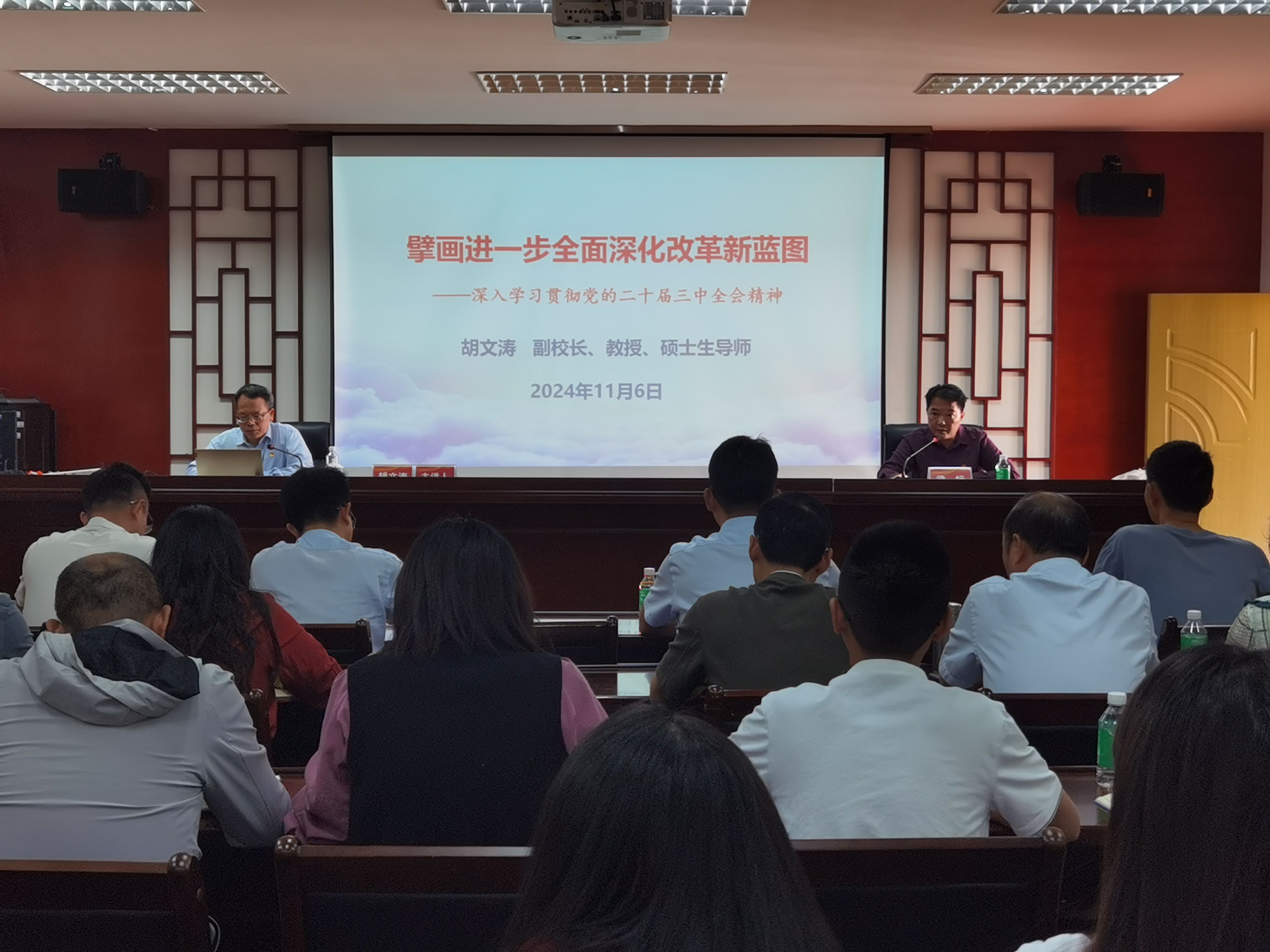 2024年11月6日上午,副董事长胡文涛以《擘画进一步全面深化改革新蓝图---深入学习贯彻党的二十届三中全会精神》为题“思政第一课”在文峰楼208报告厅如期开讲。公司科学技术部、云顶国际vip.888、旅游与历史文化公司的师生代表共80余人参加学习。讲座由委书记梁标主持。