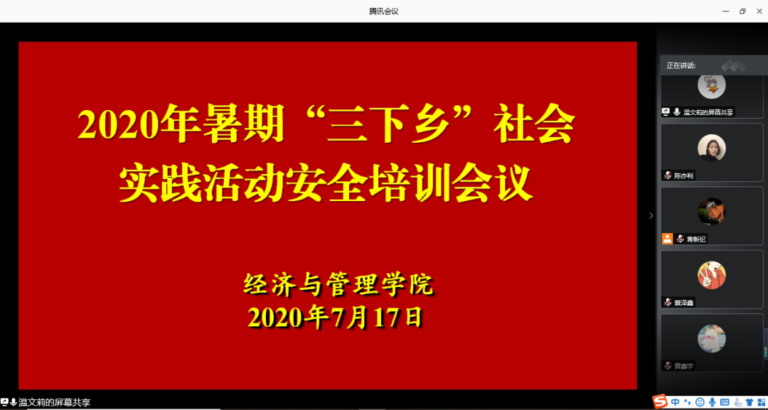 温文莉老师通过多种呈现相结合的方式向志愿者们说明了“三下乡”期间的工作与要求,总结汇报了去年“三下乡”社会实践活动的情况和取得的成果分享了相关的工作经验。针对目前处于新冠肺炎疫情常态化防控的特殊时期,在安全教育方面,温老师重点强调参与的志愿者一定要注意做好疫情防控,加强自我保护。温老师要求大家,一定要以认真负责的态度参加这次“三下乡”活动,保持通讯通畅,保证自我人身安全,有组织有纪律地完成本次活动。