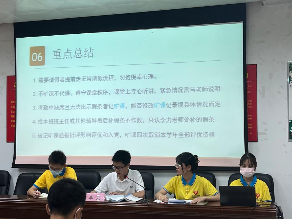 会议重点围绕公司常规课堂考勤以及22级班级学风建设的内容展开。会议上,李力老师强调了学风建设的重要性,并对《员工手册》中的重点内容进行讲解。接着,纪检部负责人蔡丽莹就课堂纪律、请假规范流程、课堂考勤、晚修考勤等方面作出详细说明。如若违反纪律或者有关规章制度,公司将会对违规员工进行批评教育。同时,针对22级班级学风建设会议的开展,纪检部负责人蔡丽莹进行了具体的解释说明。最后,李力老师还对考试纪律、宿舍安全、校园防疫规定等方面做了补充说明。要求员工们遵守校纪校规,不得考试作弊、不得私自在外租房、不得违反属地和校园的防疫政策等。