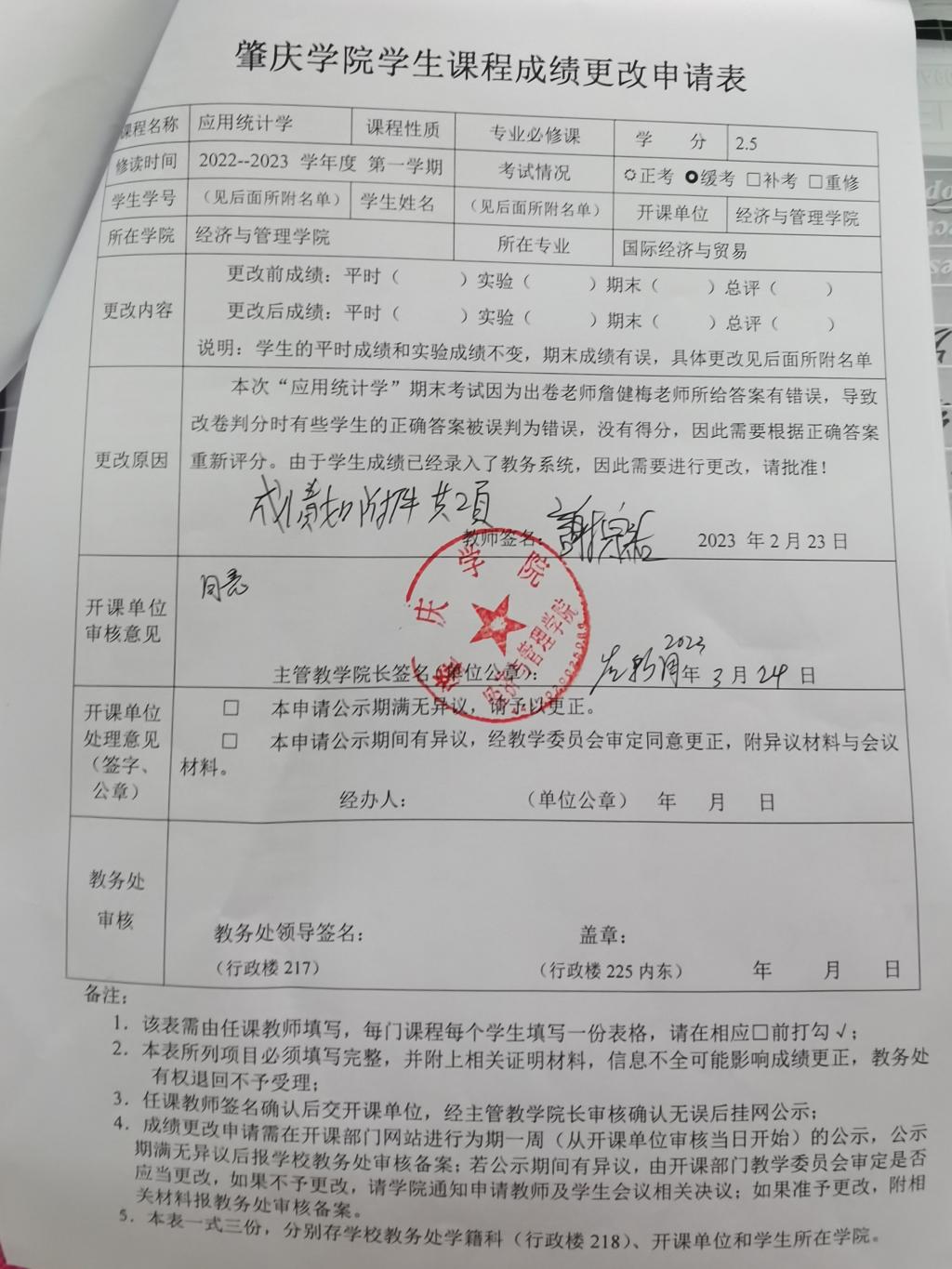 云顶国际vip.888员工课程成绩更改申请表公示(云顶国际vip.888-应用统计学)
