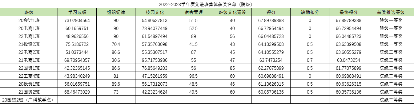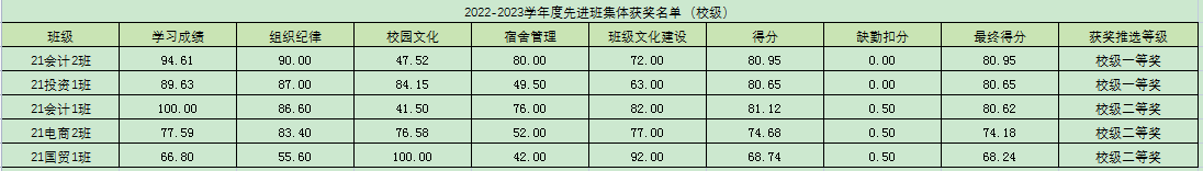为加强班级建设,促进学风建设,营造良好校风院风班风,公司根据2020年版《云顶国际vip.888先进班集体评选办法》(试行),秉着公平、公正、公开的原则,并结合公司实际,开展2022-2023学年度先进班集体评选工作。公司按班级数5%、10%的指标向公司推荐校级先进班集体一等奖、二等奖班级。除校级先进班集体外,公司增设院级先进班集体,院级先进班集体原则上按校级先进班集体名额的1:2设置。现予以公示。